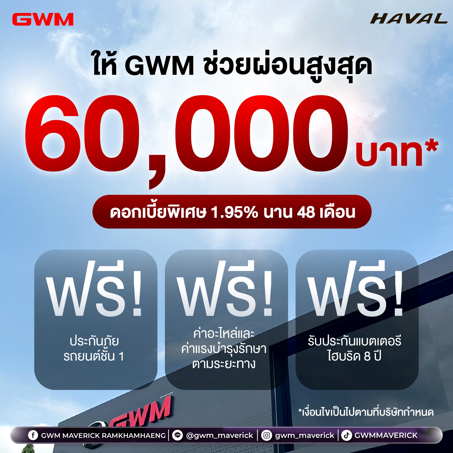 - หรือเลือกให้ GWM ช่วยผ่อน 60,000 บาท* พร้อมรับดอกเบี้ยพิเศษ 1.95% เมื่อดาวน์ 25% นาน 48 เดือน